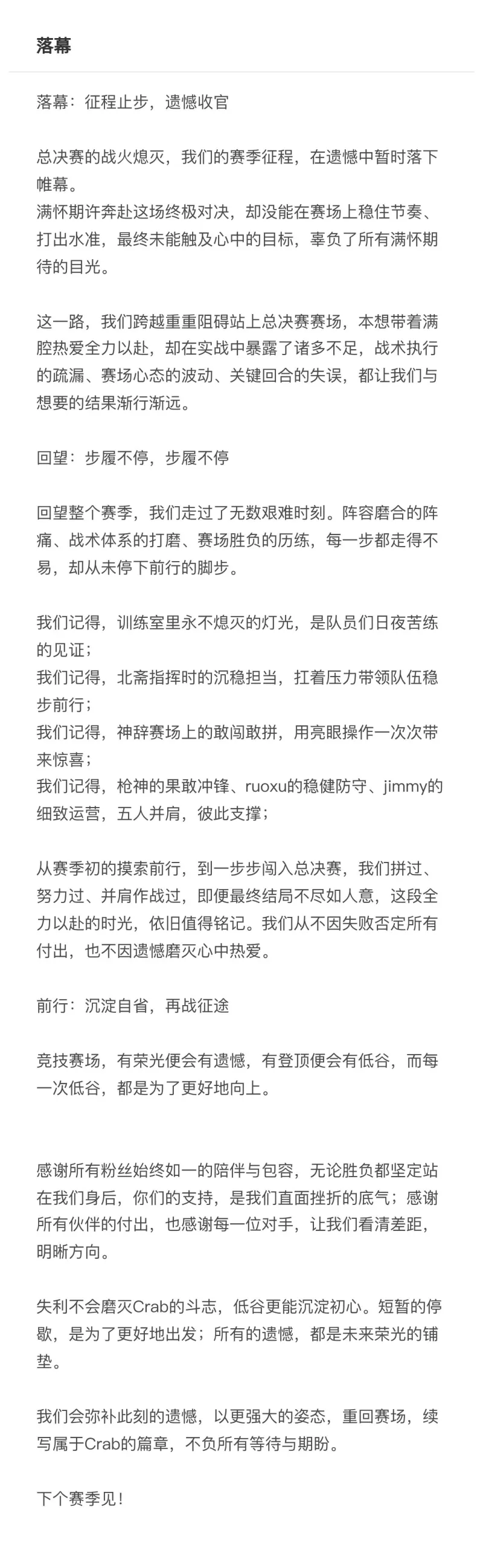 开云体育服务-倒数第一惨淡收场,Crab赛后长文:失利不会磨灭Crab的斗志