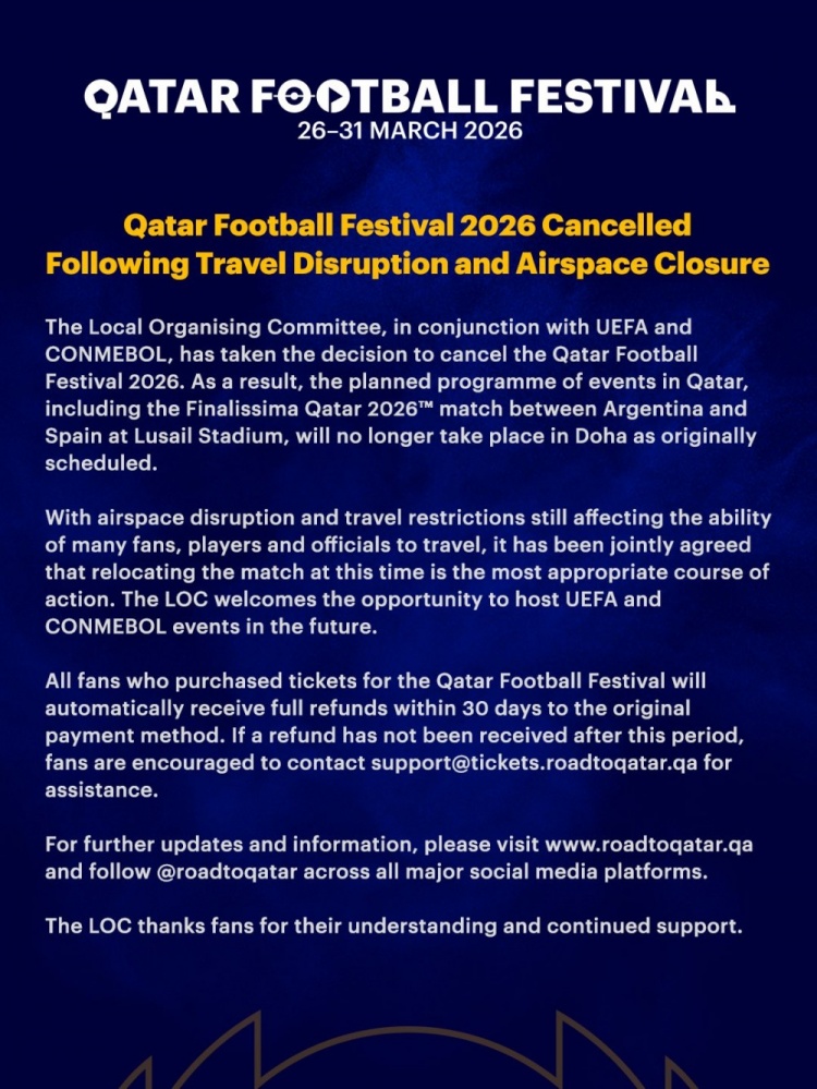 当地时间3月16日,当地组织委员会与欧足联和南美足联协商后,决定取消2026年卡塔尔足球节。因此,原定在卡塔尔举行的一系列活动,包括在卢塞尔体育场进行的阿根廷对阵西班牙的2026年卡塔尔欧美杯比赛,将不再按原计划在多哈举行。